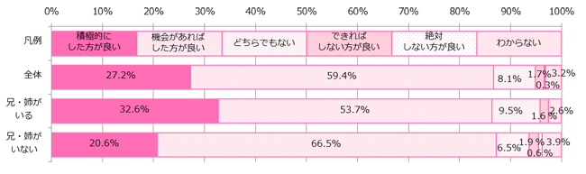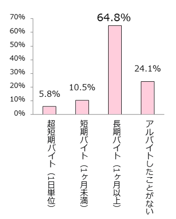 はじめてアルバイトをした年齢は16歳が全体の48.3%と、半数近くを占めました。これを、兄姉がいる・いないに分けたところ、初アルバイト年齢「15歳以下」「16歳」はいずれも兄姉がいる回答者の方が多く、「17歳」「18歳」はいずれも兄姉がいない回答者の方が多い結果となりました。家族構成は、アルバイト開始年齢に関係しているようです。