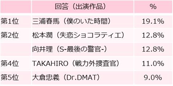 アルバイトは、新たな人間関係構築の場でもあります。そんなバイト先に先輩として働いていたら嬉しい芸能人について、今クールドラマの主人公から選出してもらいました。第1位は女子高生と最も年齢が近い三浦春馬さん(出演作品「僕のいた時間」)、第2位は松本潤さん(出演作品「失恋ショコラティエ」)、向井理さん(出演作品「S-最後の警官-」)という結果になりました。