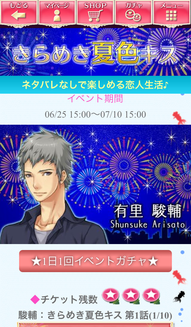 イベント「きらめき夏色キス」は夏祭りデートがテーマです。浴衣を着てお祭りに行き、花火を見たりと夏らしいデートを楽しむ中で、普段とは違う彼の新しい一面を知っていきます。イベントストーリーを進める中で発生する様々な選択肢の結果によって、多様なエンディングを迎えることが可能です。