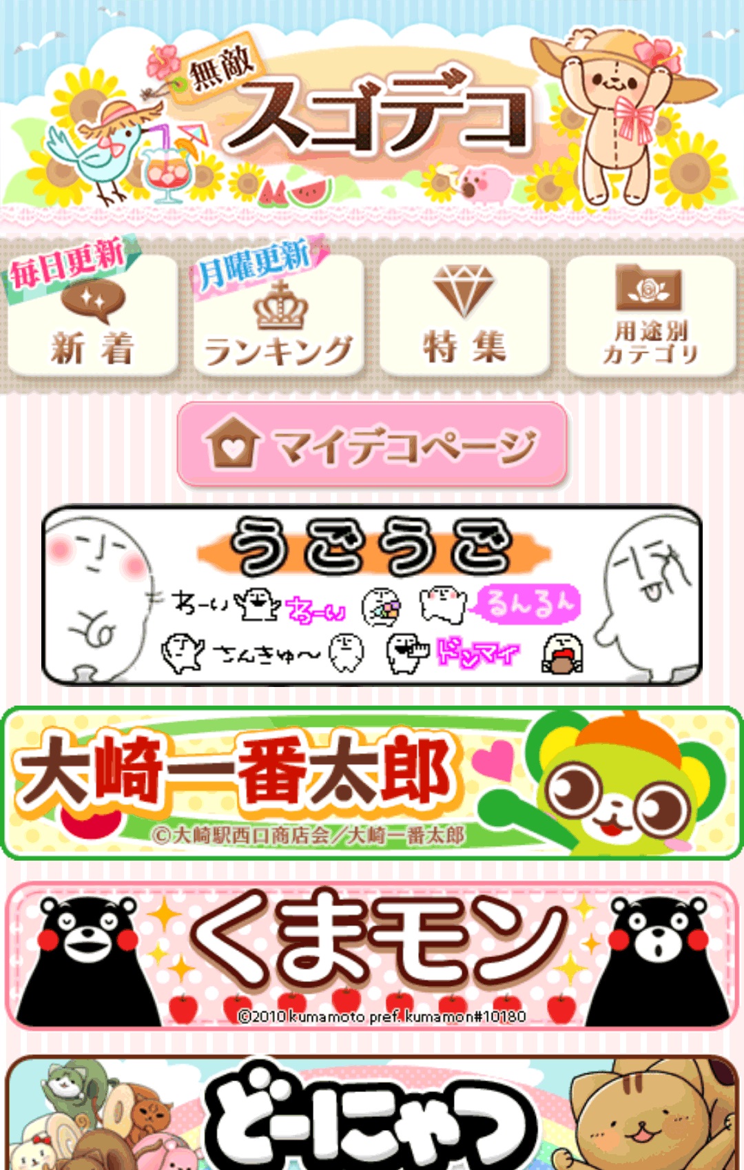 「無敵スゴデコ for au」は可愛らしいテイストからゆるいもの、ユニークなものまで10,000点以上のデコメ®素材やスタンプ素材等が揃った「auスマートパス」利用者限定サイトです。普段使いはもちろん、誕生日やクリスマスなどイベント時に使える人気キャラクターのデコメ®素材のほか、週替わりで配信される「期間限定レアデコメ」や、メッセンジャーアプリなどでも使えるスタンプやグリーティングカードなど、幅広く素材を取り揃えております。