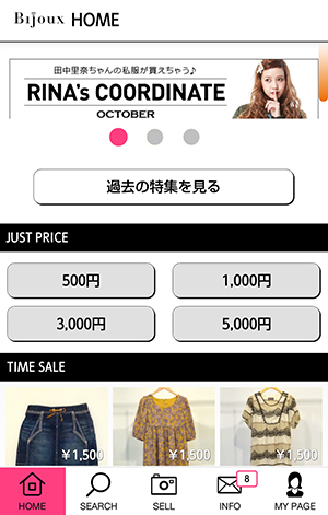 本サービスの大きな特徴は、イメージキャラクターに起用した、雑誌「mer(メル)」などで人気の読者モデル・田中里奈さんをはじめ30名以上の読者モデルの私物を購入できることです。さらに全身コーディネートされた商品を購入できるコーナー、均一価格コーナー、タイムセールなどお買い物を楽しんでいただくためのユニークな企画や、友人へのアプリ紹介などで貯まるお得なポイント制度などをご用意しております。