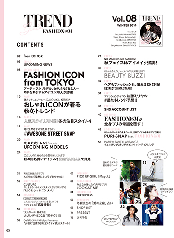 今号では、2014年11月中旬発売の最新プリントシール機『FASHIONisM(ファッショニズム)』の世界観を反映。本機種にてコラボレーションを行う加藤ミリヤさんが表紙を務める他、”FASHION ICON from TOKYO”をテーマに藤井リナさんをはじめとする時代を牽引するアーティスト・モデル・女優・ショップ店員など総勢70名が登場。最新ファッションやヘア、メイク、カルチャーを紹介します。