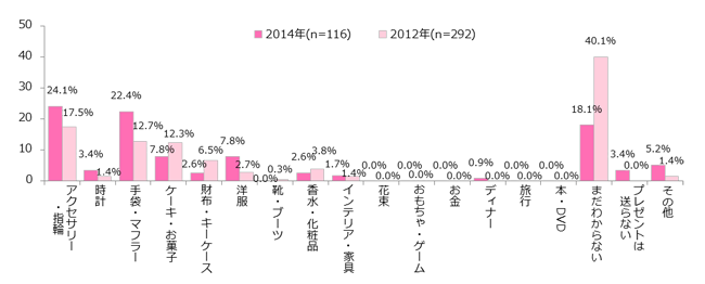 彼氏がいるのは回答者全体の55.1%。そのうち93.2%が彼氏にクリスマスプレゼントをあげると回答しました。予算の平均額は彼氏いない派に比べて3,454円多く、贈る内容は「アクセサリー・指輪」が第1位、「手袋・マフラー」が僅差で第2位でした。また、「まだわからない」という割合は、2012年11月に当研究所が実施した調査結果と比べて22.0%減っており(女子高生のみの数値で比較)、彼氏へのプレゼントは早めに決める傾向にあることが分かりました。