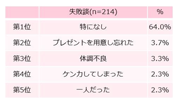 そんなクリスマスのデートについて調べたところ、全体の64.0%が「失敗談は特にない」と回答。一方、失敗談としては、「気合いを入れて高いヒールの靴を履いたら足が痛くなりスリッパでイルミネーションをみた」「プレゼントを忘れた」などが出ました。デートを成功させるためには、計画性や楽しむ気持ちが鍵となるのかもしれません。