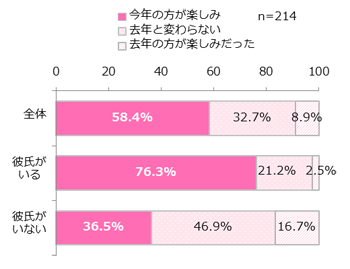 去年よりも今年のクリスマスの方が楽しみと回答した割合は、彼氏がいる派の方が約40%多く、クリスマスは彼氏がいるかどうかがモチベーションに影響することが分かりました。