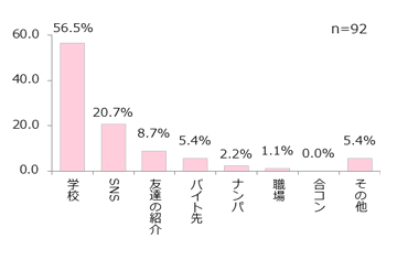 今付き合っている彼氏との出会いの場について、彼氏がいる49.5%の回答者を対象に調査しました。第1位は学生ならではの出会いの場である学校(56.6%)、そして第2位にはソーシャルネットワーキングサービス・SNSがランクイン(20.7%)、第3位は友達の紹介(8.7%)となりました。当研究所の過去調査( 2014年9月「ソーシャルメディアに関する意識調査」)によると女子高生・女子大生は、LINE、Twitter、Instagramの利用度が高く各種使い分けをしています。中でもTwitterに関しては情報入手先として最も信頼しているほか、繋がる相手については知らない人が第3位に入っており、SNSを通じた人脈の拡大が普及していることが伺えます。