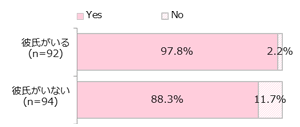 女子高生・女子大生の生活は、彼氏がいるかどうかでどれくらい生活の充実(リア充)度が変わるのでしょうか。彼氏の有無別でリア充度の平均点を算出したところ、彼氏がいる派は75.4点、彼氏がいない派は48.6点と、26.8点の差が出ました。彼氏がいない派のうち約82%は彼氏が欲しいと思っていることから、ステータスとしても彼氏の存在を重要視しているのかもしれません。