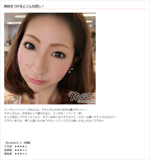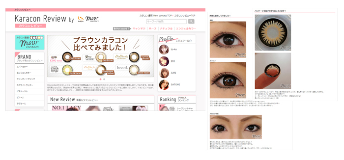 この度新たに開始したレビューコンテンツは、「お試しができない商品だからこそ購入前に詳しい情報が欲しい」、というカラーコンタクトならではのお客様の悩みを解決します。無加工の装着レンズ画像や、装着時の顔全体写真の公開、タイプの違うライター4名による投稿、メーカーを問わない切り口など、現実感にこだわった内容となっております。