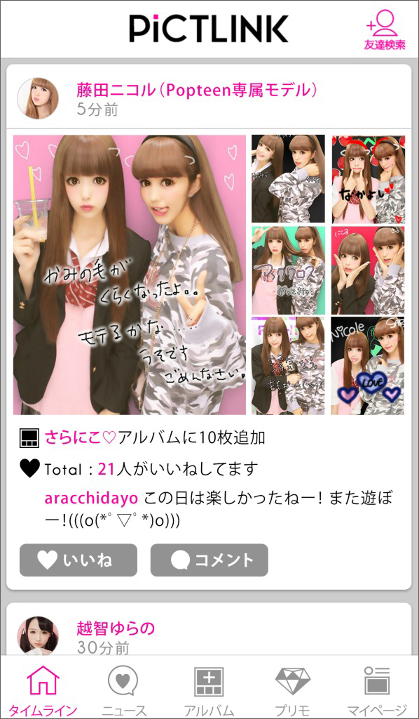 会員数800万人*を超える「ピクトリンク」は、自身で撮影したプリ画データを取得・閲覧することができるサービスです。本日より、アプリ版について”プリを介した新たなSNS”として大幅リニューアル。個人のページ(マイページ)を開設後、自身が撮影したプリ画データをアプリ上で 整理し、”プリアルバム”を作成。プリアルバムを公開することによって、情報がタイムライン上でフォロワーに共有され、「いいね!」「お気に入り登録」のアクションやコメントの投稿など、コミュニケーションを図ることが可能となっております。