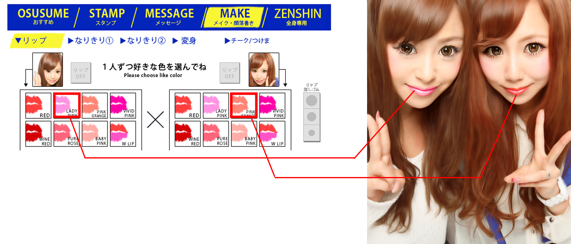 2人用コースで撮影した場合、落書き時にリップの 色を個別に選択できる機能を初搭載しました。