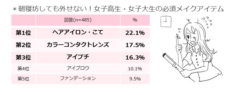 朝寝坊して支度時間が限られても「これだけは外せない!」という必須の化粧道具について調査しました。第1位はヘアアイロン・こて、第2位はカラーコンタクトレンズ(カラコン)、第3位はアイプチ(目の二重線を作るのり)という結果でした。女子高生・女子大生は、肌質を作ったり彩るよりも、髪や瞳などの大きさ・形を変える方が印象を左右するとして重要視しているようです。特にカラーコンタクトレンズは、人と会うときや外出時は常に装着しているという声も多く、可愛くおしゃれになるための必須のアイテムとして新定番となった化粧道具と言えます。