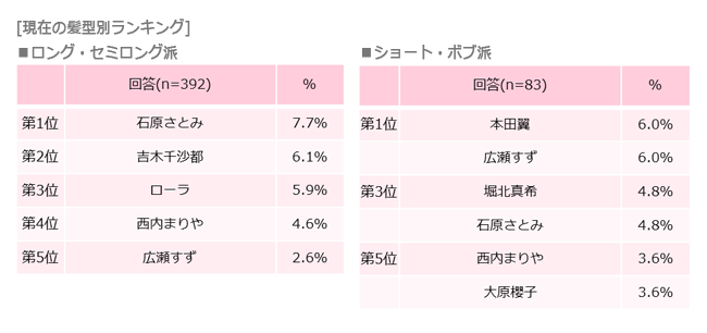 髪型の参考にしたい芸能人第1位は、ショートヘア部門(現在ショート・ボブの回答者)では本田翼さんと広瀬すずさん、ロングヘア部門(現在ロング・セミロングの回答者)では石原さとみさんでした。本田翼さんは前回(2013年2月調査)でも1位を獲得しており、ショートヘアのお手本として女子高生・女子大生から根強い支持を得ているようです。