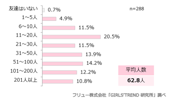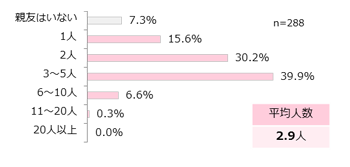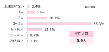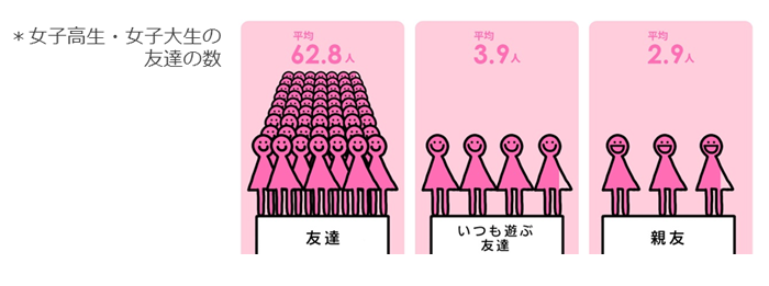 友達は平均62.8人、いつも遊ぶ友達は平均3.9人、親友は平均2.9人