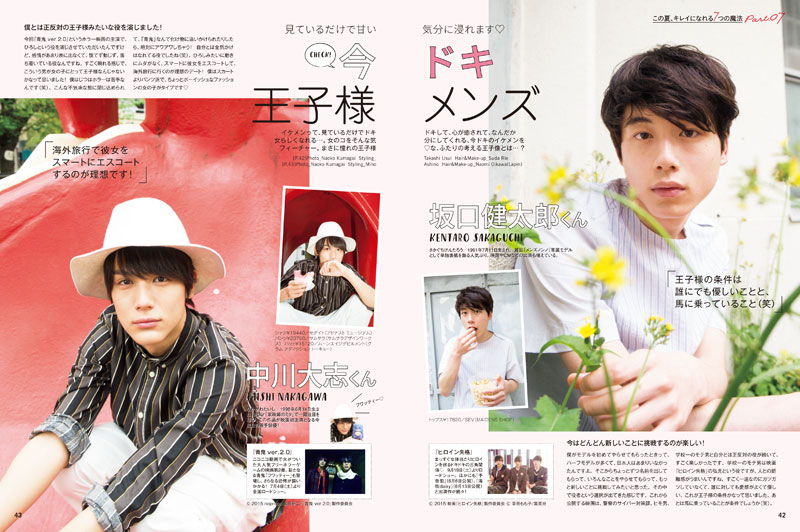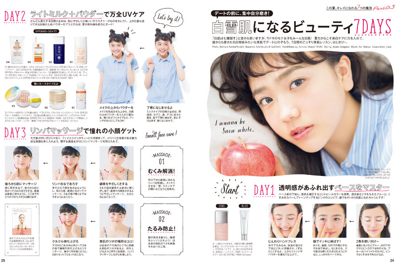 最新号では、今夏発売予定の最新プリ機『Shirayuki(シラユキ)』と連動し、誌面を展開。本機種におけるコンセプトの1つ「プリ機ユーザーが抱く “7つの願い”を叶える」ということに関連し、本誌では「この夏、キレイになれる7つの魔法」をテーマに、トレンドのファッション・メイク等を特集しております。モデルや女優として活躍中の松井愛莉(まついあいり)さんが”白雪肌”づくりの秘訣を紹介。また、見ているだけで甘い気分に浸ることができる「今ドキ王子様メンズ」として坂口健太郎さん、中川大志(なかがわたいし)さんのインタビュー等を掲載いたします。