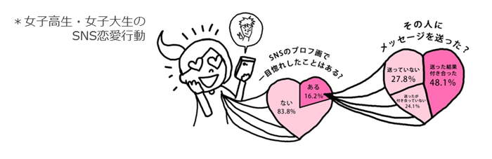 女子高生・女子大生が日々触れているソーシャルネットワーキングサービス(SNS)について、恋愛との関連性を調査したところ、16.2%がSNSのプロフィール画像に対する一目惚れを経験していることが分かりました。また、そのうち48.1%は相手にメッセージを送り、結果付き合ったようです。回答者は学生のため、SNSがきっかけで学校など元から存在していた何かしらの共通点を知り、恋愛に発展した可能性が高いかもしれません。なお積極性が見られる一方で、当研究所が行った別調査によると、SNS利用時に気を付けている事の上位3位には「個人情報を載せない」「悪口を書かない」「個人を特定されるような写真を載せない」がランクイン。気を付ける観点を持ちながら利用しているようです。