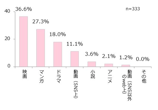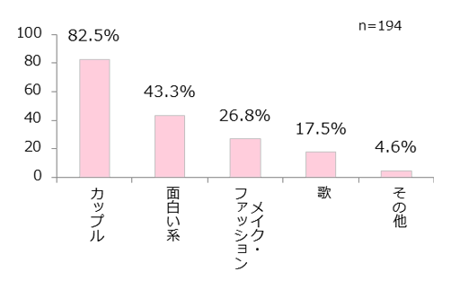 カップルのラブラブシーンを、どのメディアで見ると最もキュンとするのでしょうか。第1位は映画(36.6%)、第2位はマンガ(27.3%)、第3位はドラマ(18.0%)となり、第4位にSNS上の動画(11.1%)がランクインしました。最近若年女性から人気を集めているMixChannelの認知度は本調査では76.6%を記録。このような短編動画は、スマートフォンの普及に伴って多様性を増しており、また、より身近に感じられることから、女子高生・女子大生が影響を受ける存在のようです。