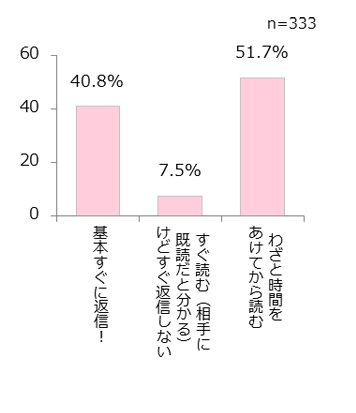 恋愛に告白はつきもの。LINEで告白した、もしくは告白された経験を調査したところ、あると回答した割合は78.7%でした。また、告白手段として直接かLINEかという二択質問では、LINEが34.5%を占める結果に。告白に至るまでの段階については、気になる相手とLINEでやり取りする際、返信はわざと時間を空けて読む派が51.7%を占めました。LINEでの駆け引きにおいては、メッセージを読むタイミングにも意図があるようです。