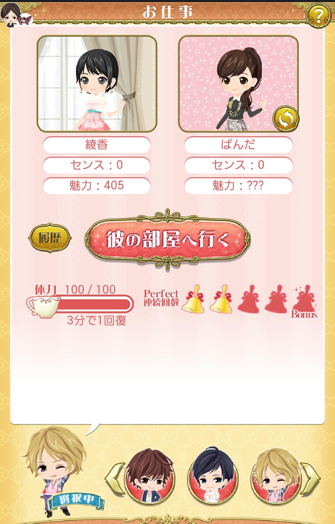 本編とは別に、ホテルウーマンとして「ルームサービス」の仕事をこなすミニゲームが毎日発生。自分の好きなキャラクターのお部屋へ行くことができ、クリアすると獲得できるチップ(ポイント)をストーリーチケットやアバター、好感度等の購入にご利用いただけます。ときめくストーリーが発生して、好感度がアップすることも。