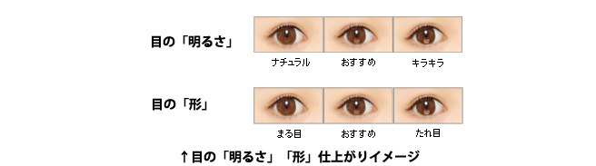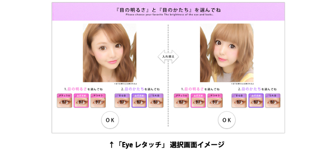 瞳に入る光の量を3段階から調整できる【目の明るさ】選択機能、目の形を3種から調節できる【目の形】選択機能を新たに搭載いたします。2人用コースで撮影した場合は、個別にそれぞれの調節が可能です。