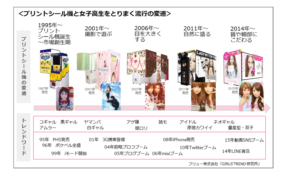 フリュー株式会社(本社:東京都渋谷区、代表取締役社長:田坂吉朗 以下、フリュー)が運営する『GIRLS’TREND(ガールズトレンド) 研究所』は、この度プリントシール機の誕生20周年を記念し、「プリントシール機と女子高生をとりまく流行の変遷」についてその20年の歴史をまとめました。