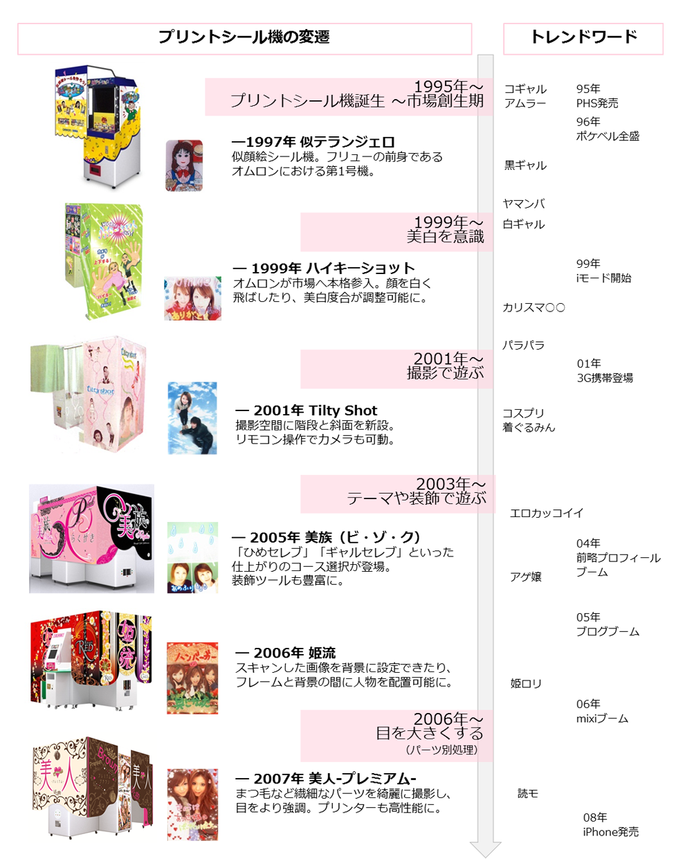 1995年7月にプリ機が誕生し、2015年で20周年を迎えます。顔を美しく加工する画像処理技術の向上や、高性能カメラ・プリンターの搭載など、ソフト・ハードの面での進化は勿論のこと、シールを交換していた時代から、現在は撮影データをスマートフォンに転送し、SNSでシェアし合う時代へと、その遊び方も、時代に合わせて進化をしています。
