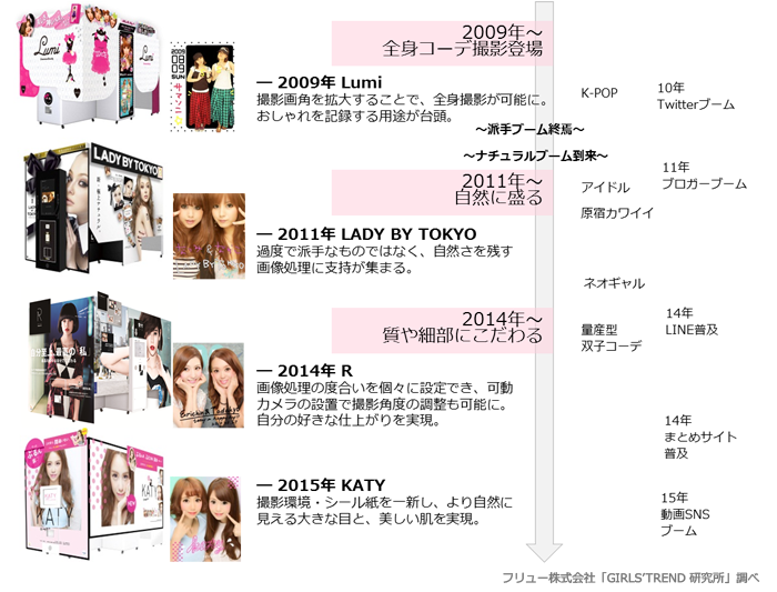 プリントシール機は、常に女子高生を中心とした若年女性から支持を集めており、商品の歴史はその世代の流行と密接に関係しています。『GIRLS’TREND 研究所』は、現在同市場においてトップシェアを占めるフリューにおける調査・研究機関として、今後もお客様の価値観に寄り添い、流行と共に新たな提案を続けて参ります。