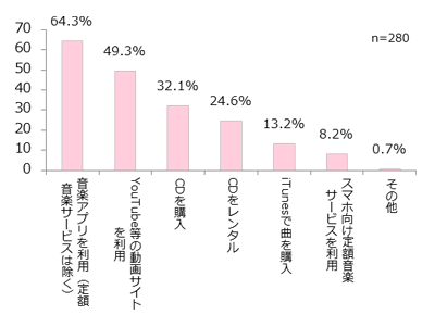 ※複数回答 ※音楽を入手する際に、「CDを購入」「CDをレンタル」「iTunesで曲を購入」「音楽アプリを利用(定額音楽サービスは除く)」「スマホ向け定額音楽サービスを利用」を選択した人のみ