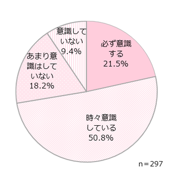 写真を撮る時にソーシャルネットワーキングサービス(SNS)を意識するかどうかについて調査しました。「必ず意識する」が21.5%、「時々意識している」が50.8%となり、SNS投稿を意識する派の割合が72.3%にものぼりました。TwitterやInstagramが女子高生・女子大生の間で普及していることから、公開や共有が撮影目的として定着しつつあるようです。
