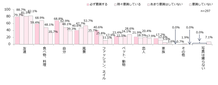 また、被写体種別を先述の意識度合い別に分析したところ、いずれも「友達」を最も撮影していることが分かりました。さらに、SNS投稿を意識する派は「自分」や「ファッション・ネイル」を被写体とする率が高い結果に。自撮り(セルフィー)が流行していることもあり、撮影した写真を他者に見られることへの抵抗感が薄れてきているのかもしれません。その他にも「食べ物・料理」「家族」など様々な被写体の活用度が高いことから、SNSへの意識度合いが強い方が被写体のバリエーションが豊かになるという傾向にあるようです。