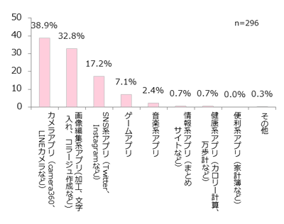 1日に携帯電話やスマートフォンで撮影する写真の枚数について調査したところ、「0枚」と回答した割合は3.7%でした。写真のデジタル化や、いつでも写真撮影や画像編集ができる環境、そしてSNSの普及による撮影動機の増加といったことが起因しているようです。なお携帯端末に保存されている画像の枚数は、平均2,974枚という結果に。ダウンロードしたアプリの中で最も多いジャンルは第1位がカメラアプリ、第2位が画像編集アプリだったことからも、女子高生・女子大生は写真への関心度が非常に高いことが伺えます。