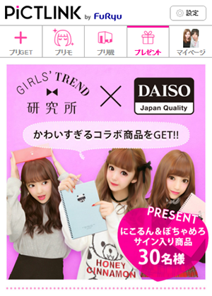 コラボレーション商品の発売を記念し、「ザ・ダイソー」原宿店、心斎橋店でイベントを開催。そのイベントに登壇するモデルの藤田ニコルさん、飯泉吏南さん、田中芽衣さんのサイン入りコラボレーション商品を、抽選で30名にプレゼントいたします。フリューのプリントシール機で撮影した画像をフィーチャーフォンやスマートフォンにて取得・閲覧できるサービス「ピクトリンク」よりご応募いただけます。