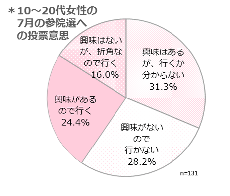 初めて選挙権が”20歳以上”から”18歳以上”まで引き下げられる7月の参議院選挙に関して、10~20代の女性を対象に投票への意思を調査しました。最も多かったのは「興味はあるが、行くか分からない」(31.3%)、続いて「興味がないので行かない」(28.2%)、「興味があるので行く」(24.4%)、「興味はないが、せっかくなので行く」(16.0%)という結果でした。全体傾向として、投票へ行く予定の割合は全体の40.5%となり、投票への興味を示した割合である55.7%を下回りました。