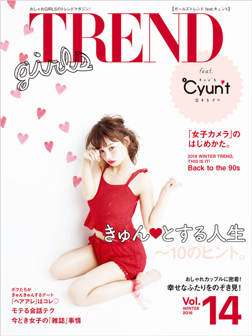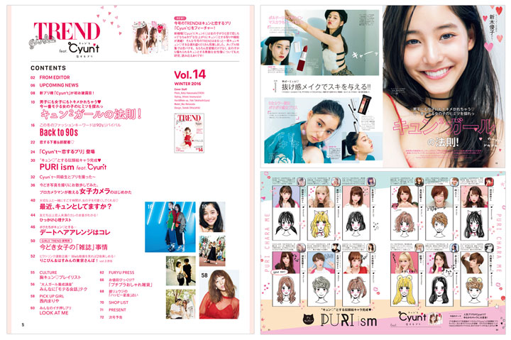 今号では、2016年11月中旬発売予定の最新プリ機『Cyun’t(キュント) ~恋するプリ~』(以下、Cyun’t)にちなんで、女の子の心をときめかせるような様々な企画を展開。巻頭特集では、誰もがときめく”キュンキュンガール”の代表として人気急上昇中の女優・新木優子(あらきゆうこ)さんが登場し、メイク、スキンケアなどの秘訣を紹介します。また、プリ機『Cyun’t』での撮影を通して、自分似のキャラクター画像が作成できる機能「プリキャラミー」を、藤田ニコルさんをはじめ12名の人気モデルが体験。個性豊かなキャラクター画像をご覧いただけます。