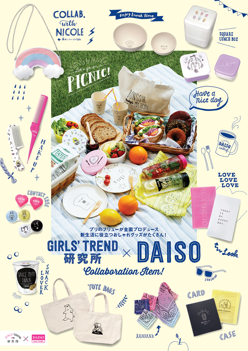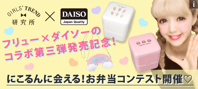 株式会社大創産業(本社:広島県東広島市、代表取締役社長:矢野博丈、以下 ダイソー)と、フリュー株式会社(本社:東京都渋谷区、代表取締役社長:田坂吉朗、以下 フリュー)が運営する女子高生・女子大生の動向調査・研究機関『GIRLS’TREND(ガールズトレンド) 研究所』(所長:稲垣涼子)は、2017年2月1日(水)より全国の「ダイソー」にて順次発売予定の”ダイソー×フリュー『GIRLS’TREND 研究所』第3弾コラボレーション商品”について、全72商品の内容を発表いたします。