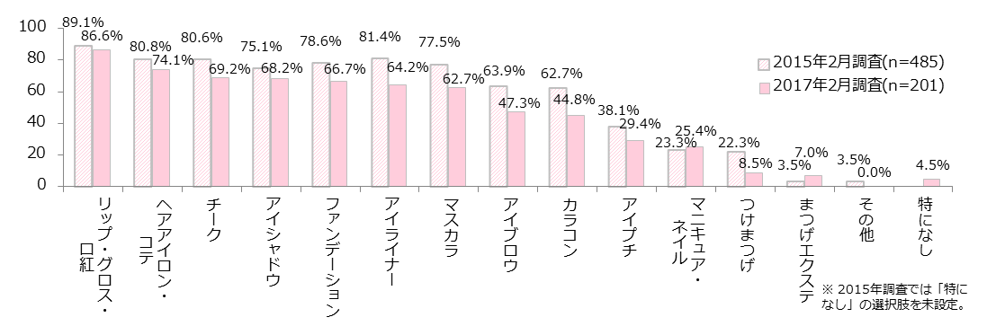 化粧道具事情について調査しました。現在使用しているアイテムとして、「リップ・グロス・口紅」(86.6%)、「ヘアアイロン・コテ」(74.1%)、「チーク」(69.2%)が上位3位にランクイン。「リップ・グロス・口紅」は前回調査*2同様に第1位となり、安定した人気を得ました。さらに、日常的に使用するアイテムが数種類ある中でも”時間がなくても外せないマストアイテム”を調べたところ、女子高生は「ヘアアイロン・コテ」(19.9%)、女子大生は「ファンデーション」(21.8%)を最も多く選択。女子高生は”髪”を、女子大生は”肌”をそれぞれ重視しているようです。
