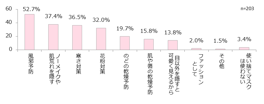 使い捨てマスクの用途は「すっぴん・肌荒れ隠し」と「寒さ対策」がそれぞれ約4割