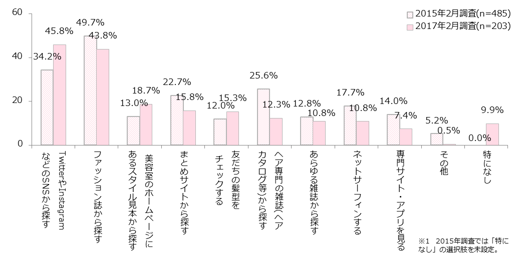 では、彼女たちは、自身の髪型を決める際に何を参考にしているのでしょうか。第1位には「TwitterやInstagramなどのSNSから探す」(45.8%)、第2位には僅差で「ファッション誌から探す」(43.8%)がランクインしました。特に、SNSは前回調査*2よりも11.6ポイント上昇。SNSが女子高大生世代へ定着するにつれ、日々のSNS利用を通じて目にする画像などの情報は、髪型の参考先としても活用される場面が増えているのかもしれません。