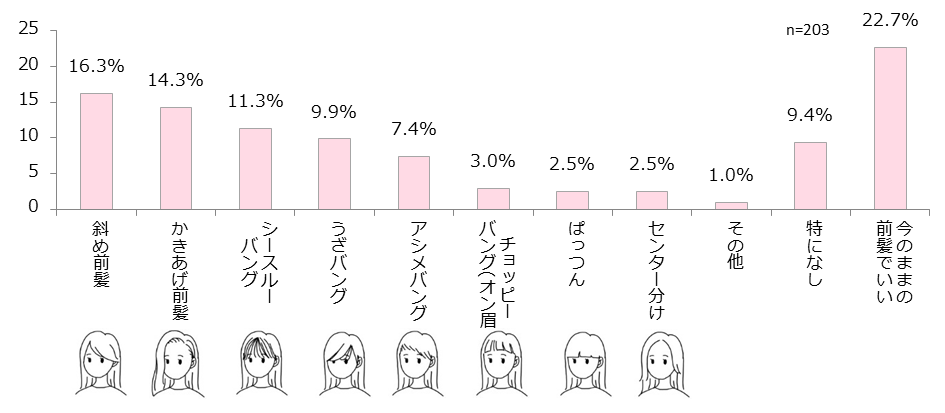 生活環境の変化が多い春は、イメチェンを意識する人が増える季節でもあります。髪型について調査したところ、今の長さはセミロングの人が48.3%、ロングの人が24.1%となりました。また、回答者全体のうち、この春に”髪の長さを変えたい”、”今より髪を伸ばしたい”と考えられる人はそれぞれ69.5%、45.8%を占めました。前髪については、全体の約7割がこの春に変更を希望。「斜め前髪」や「かきあげ前髪」といった王道スタイルが上位に入る一方、第3位以降は「シースルーバング」、「うざバング」、「アシメバング」、「チョッピーバング」と近年流行りの”今っぽ”スタイルが続き、全体の36.5%を占めました。