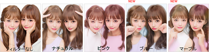 人気のナチュラルフィルター、ピンクフィルターに加え、透明感がありクールな印象を与える”ブルーフィルター”とカラフルで華やかな印象を与える”マーブルフィルター”を新搭載。