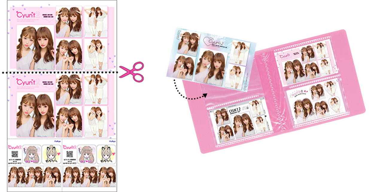 従来の縦型(長財布に収まるレイアウト)ではなく、名刺サイズのシールレイアウト「ポケットプリ」を採用。おまけ部分をはさみで切り取ることで市販のカードファイル等に収納することができます。