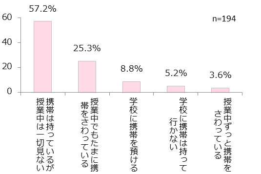 授業中の携帯端末の使用について調査したところ、「携帯は持っているが、授業中は一切見ない」と回答した割合が57.2%を占め、第2位の「授業中でもたまに携帯を触っている」(25.3%)と31.9ポイントの差をつける結果となりました。今や大半の女子高生が携帯端末を所有していますが、授業の最中は携帯に触れていない人が半数以上もいるようです。