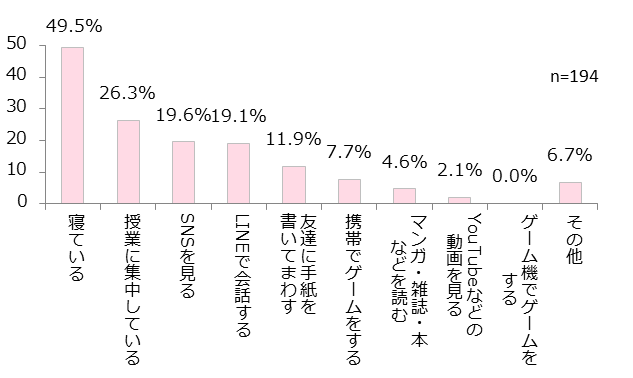 なお、「授業中についついしてしまうこと」の上位3位は、「寝ている」(49.5%)、「SNSを見る」(19.6%)、「LINEで会話をする」(19.1%)でした(「授業に集中している」(26.3%)を除く)。