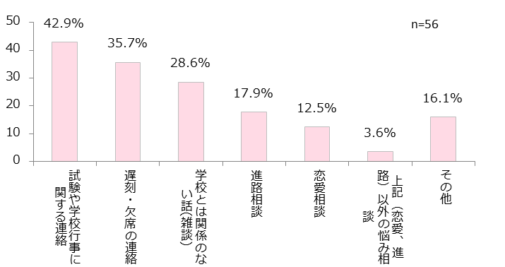 なお、学校の先生と実際にLINEでやりとりする内容について聞いたところ、「試験や学校行事に関する連絡」、「遅刻・欠席の連絡」に続き、「学校とは関係のない話(雑談)」が上位3位に入りました。事務連絡が主な用途のようですが、一部の女子高生はより近しい距離感でのコミュニケーションも取っているようです。