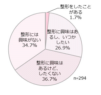 なお、整形については施術経験者は1.7%に留まったものの、「整形に興味はあるし、いつかしたい」と回答した割合は全体の26.9%を占めました。