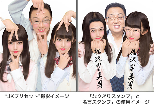 『「JKプリセット」撮影イメージ』『「なりきりスタンプ」と「名言スタンプ」の使用イメージ』