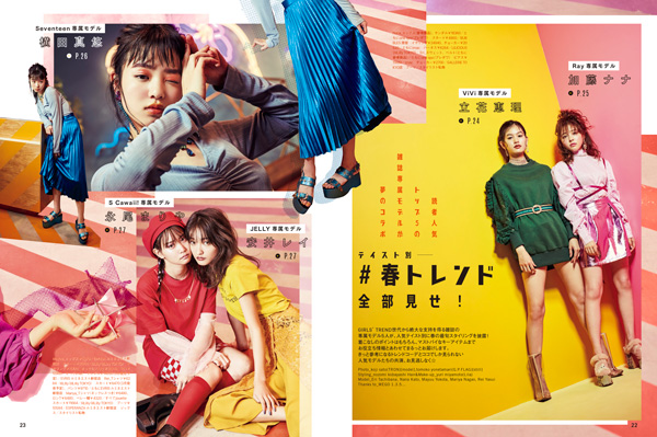 ファッションページには、女子高大生に人気の5大ファッション雑誌でそれぞれ専属モデルを務める、加藤ナナさん(Ray)、立花恵理さん(ViVi)、永尾まりやさん(S Cawaii!)、安井レイさん(JELLY)、横田真悠さん(Seventeen)の5名が登場。春の最新スタイリング特集を通して、本誌でしか見ることのできないモデルたちの共演をお楽しみいただけます。