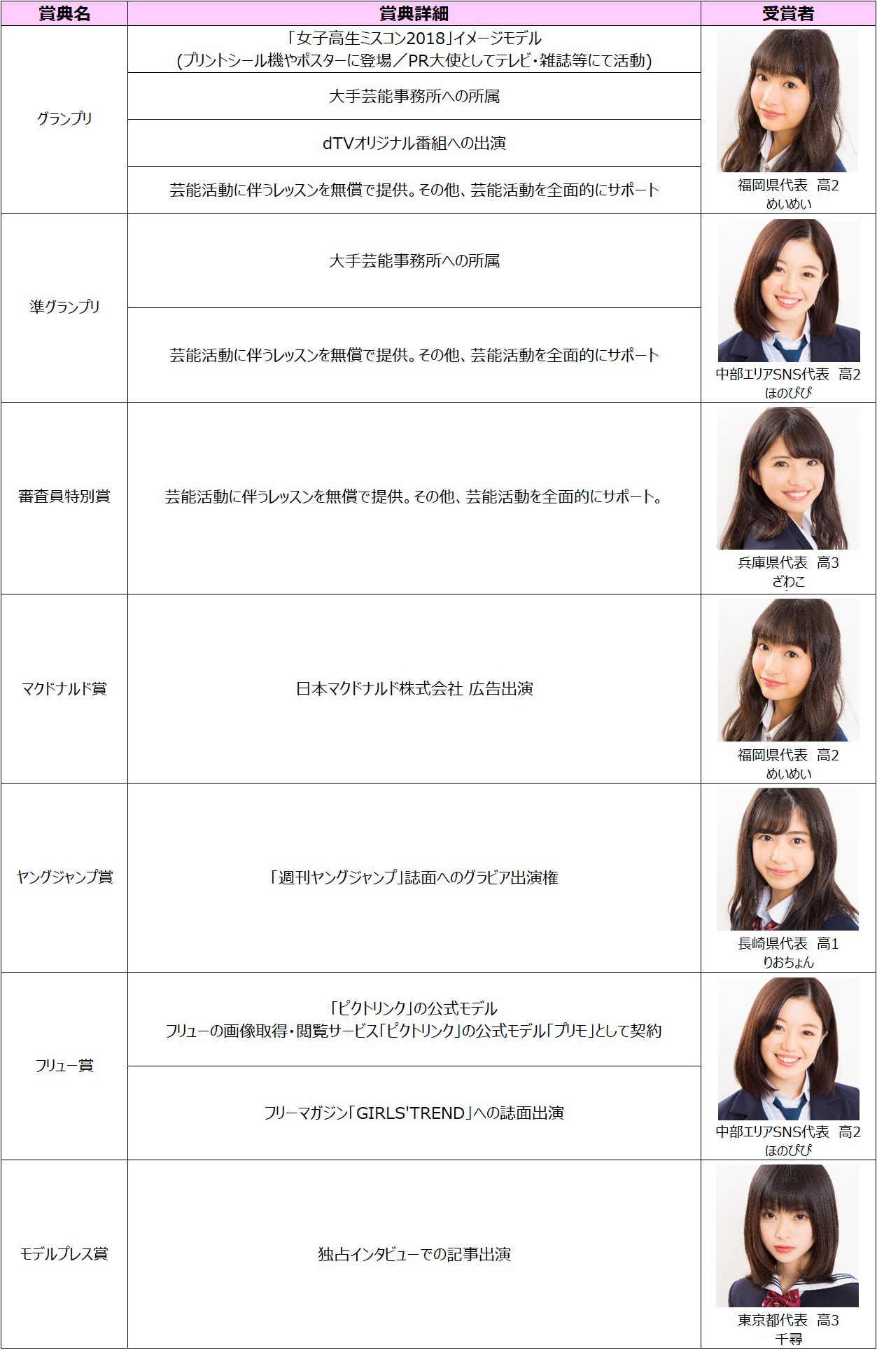 ファイナル審査には、応募者約30万人の中から選ばれたファイナリスト8名が出場。ウォーキング、ダンス&ヴォーカル、演技の実技審査に挑みました。審査員らは実技審査の結果と、プリントシール機での投票結果(実施期間:2017年12月22日から2018年3月7日まで/総投票数:約62万票)をもとに、グランプリ1名と各部門の受賞者を決定。グランプリを受賞した福岡県代表のめいめいさんには、”「女子高生ミスコン2018」PR大使”として雑誌やテレビなどにおいて本ミスコンのPRを行っていただくほか、映像配信サービス「dTV」オリジナル番組への出演権利、大手芸能事務所へ所属できる権利などを授与いたしました。