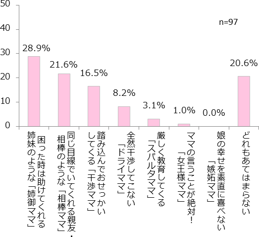 母親のキャラクターについて聞いたところ、第1位は「困ったときは助けてくれる姉妹のような”姉御ママ”」(28.9%)、第2位は「同じ目線でいてくれる親友・相棒のような”相棒ママ”」(21.6%)、第3位は「踏み込んでおせっかいしてくる”干渉ママ”」(16.5%)でした。また、母親願望がある回答者のなりたい姿として、「相棒ママ」と「姉御ママ」の割合が高い結果となりました。お互いを尊重し合える関係性が主流であり、自分の理想でもあるようです。