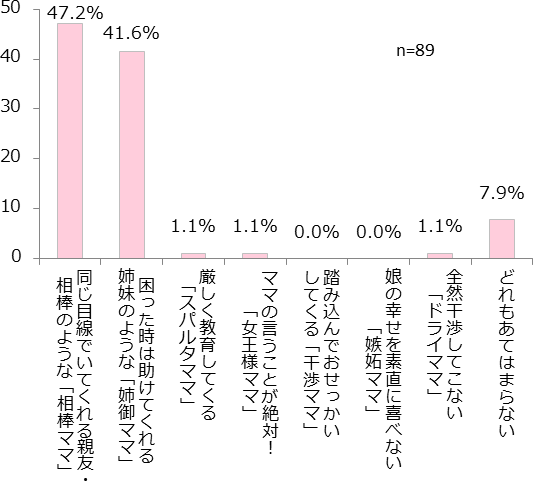 なお、理想の母親のイメージとしては、「料理・家事が得意」(48.2%)、「優しい」(39.1%)、「おしゃれ」(31.8%)が上位3位に入りました。見た目に関する「おしゃれ」という要素が3位ランクインしたのは、友だちや姉妹のような母娘が多いことが影響したのかもしれません。