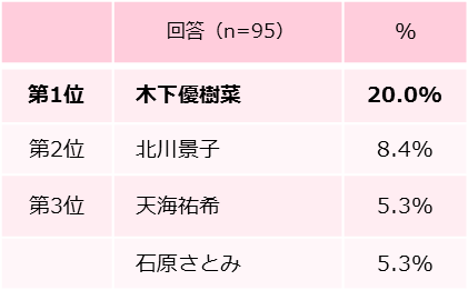 理想の母親を芸能人で例えると誰なのかを聞いたところ、モデル・タレントの木下優樹菜さんが第1位(20.0%)となりました。木下さんは、今回調査を以て4回連続で1位を獲得したことになります。女子高生・女子大生からの憧れが継続している理由の一つとして、Instagramなどのソーシャルメディアを通じて、家庭の様子を積極的に投稿し、その内容への支持が集まっていることがあると思われます。なお、2位以降には北川景子さん(8.4%)、天海祐希さん(5.3%)、石原さとみさん(5.3%)と、人気女優陣がランクインしました。